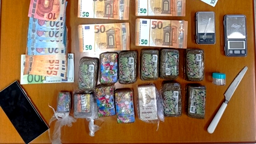 All’interno dell’abitazione sono stati inoltre sequestrati un coltello da cucina con la lama intrisa di hashish, due bilancini di precisione, una macchina conta-soldi e, nascosti tra gli indumenti e in una cassaforte, 26.785 euro in contanti, ritenuti provento dell’attività di spaccio.
