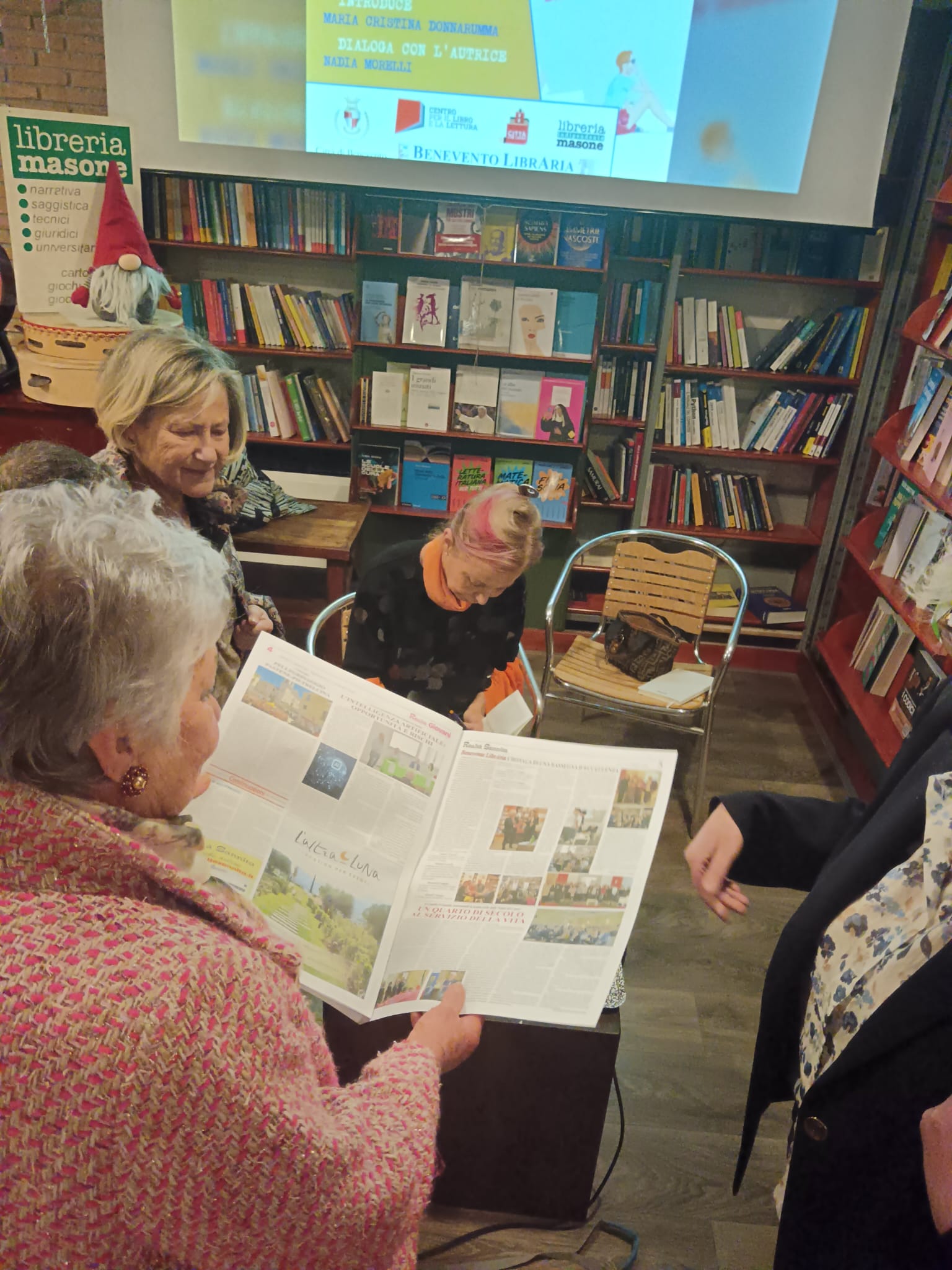 La prof.ssa Donnarumma , oramai in pensione da 16 anni, ma attiva più che mai sul piano letterario, sabato 18 aprile durante la presentazione del libro “Lunario dei giorni insonni” di Elvira Seminara – Einaudi svoltasi nella storica Libreria Masone , ha ringraziato con particolare affetto l’Assessore Antonella Tartaglia Polcini per averle dato l’opportunità con il progetto LibrAria di vivere ancora tra i libri, per i libri e con gli autori. Visibilmente emozionata la Prof.ssa Donnarumma ha ringraziato anche tutti i cari “amici” sempre presenti in questi appuntamenti, ma anche coloro che si avvicinano in punta di piedi al mondo della lettura.