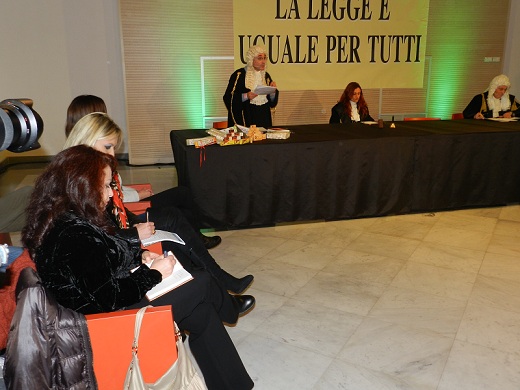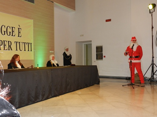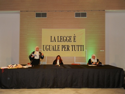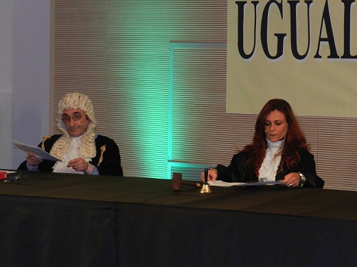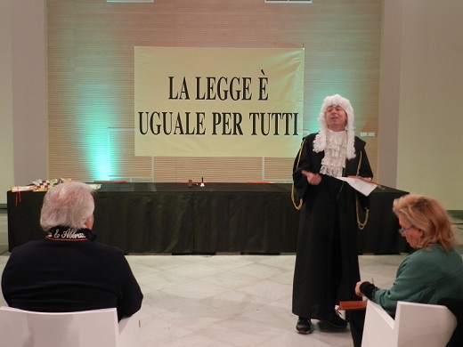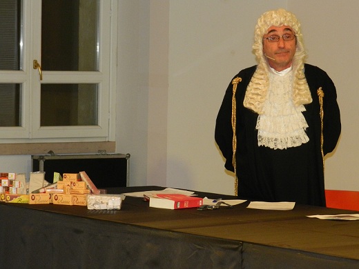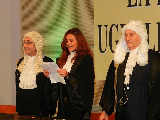 Nel salone di rappresentanza dello storico palazzo, dunque, adibito ad aula di giustizia, ha avuto luogo la messinscena, divertente sì, ma supportata da tutti i crismi di una vera udienza di tribunale, con tanto di toghe, scenografiche parrucche, testimoni e giuria popolare, quest'ultima composta da Mario Chiusolo, in qualità di presidente, dalle giornaliste Erica Di Santo (Gazzetta di Benevento), Annamaria Gangale (Realtà Sannita) e Anna Liberatore (Il Sannio Quotidiano) e dal giovane Eugenio Delli Veneri.