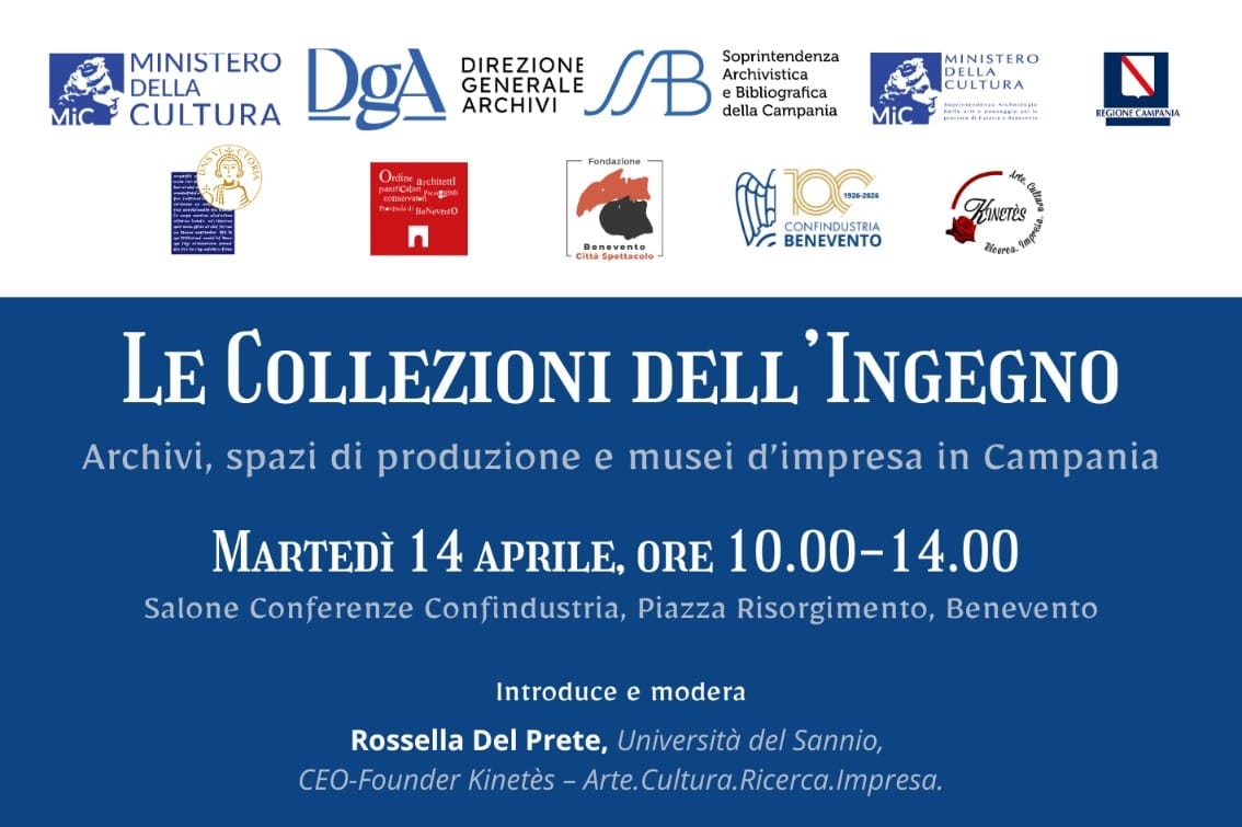 Martedì 14 aprile 2026, dalle ore 10,00 presso la Sede di Confindustria Benevento, si svolgerà il convegno Le Collezioni dell’Ingegno. Archivi, spazi produttivi e musei d’impresa dedicato al tema della cultura d’impresa tra identità, innovazione e comunicazione, organizzato dall’impresa culturale Kinetès in collaborazione con Confindustria BN e con il patrocinio del Ministero della Cultura. Il progetto rientra in una più ampia progettualità dedicata al patrimonio culturale, in particolare museale, delle Aree Interne della Campania condotto ormai da anni dal Centro di Ricerca Kinetès, diretto dalla Prof.ssa Rossella Del Prete, con il contributo della Regione Campania – DG “Politiche Culturali e Turismo” - Settore Promozione e Valorizzazione Beni Culturali”, diretto dalla Dott.ssa Nadia Murolo.