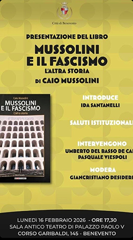 Lunedi 16 febbraio, alle ore 17,30, nella sala Antico Teatro di Palazzo Paolo V, al Corso Garibaldi 145, si terrà, con il patrocinio del Comune di Benevento, la presentazione del libro di Caio Mussolini “Mussolini e il fascismo. L’altra storia”.