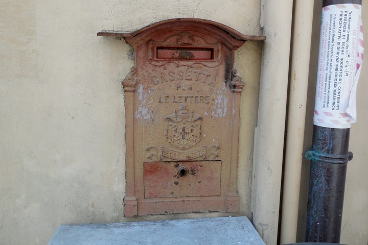 Per la verità quest’ultima non è visibilissima, in quanto incassata nel muro di un palazzo e semicoperta da un bidone per l’immondizia su cui è posto anche un voluminoso posacenere di metallo, ma appena ci si avvicina ecco che si legge a chiare lettere “CASSETTA PER LE LETTERE REGIE POSTE”.