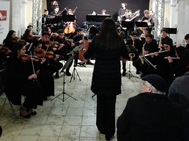 La galleria di Palazzo Bosco Lucarelli è stata la suggestiva cornice che ha inquadrato il Concerto di Natale dell'Orchestra 'Guacci' di Benevento. La serata fredda, in perfetto clima natalizio, è stata riscaldata dai ritmi jazz splendidamente eseguiti dagli alunni del Liceo Musicale.