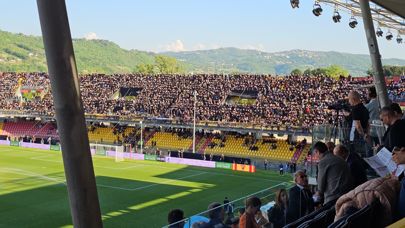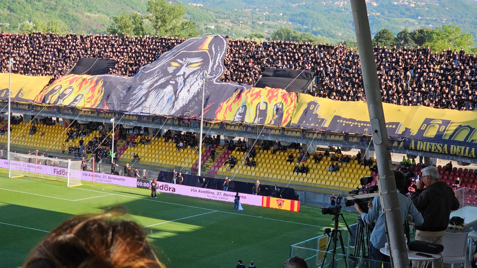 Altro giorno, altra festa. Da quasi un mese a questa parte, a Benevento c’è sempre motivo per gioire della conquista della promozione nel campionato cadetto. In occasione di Benevento-Cerignola, però, i giallorossi l’hanno fatta davvero grossa. Era arcinota l’organizzazione di una mastodontica coreografia in programma per l’ultimo turno di campionato contro i pugliesi. Nessuno, però, l’avrebbe immaginata così maestosa, proposta davanti ad un pubblico così caloroso. Più di 10.000 tifosi giunti al ‘Vigorito’ per salutare e ringraziare la squadra ancora una volta si sono trovati davanti ad uno spettacolo audio-visivo memorabile curato dalla Curva Sud, dal titolo “Orgoglio Sannita”. Senz’altro tra le più belle coreografie degli ultimi vent’anni di tifo giallorosso.