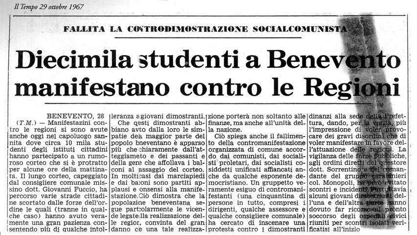 Venendo ai tempi più recenti, ovvero alla vigilia dell’approvazione della legge istitutiva che portò alle prime elezioni regionali nel 1970, la città fu protagonista di una serie di manifestazioni studentesche che coinvolsero migliaia di studenti delle scuole di Benevento guidati dai leader della destra giovanile di Benevento. Il quotidiano “Roma” (31 ottobre 1967) parlava di “settemila studenti” mentre “Il Tempo” (29 ottobre 1967) così titolava: “Diecimila studenti a Benevento manifestano contro le regioni”.