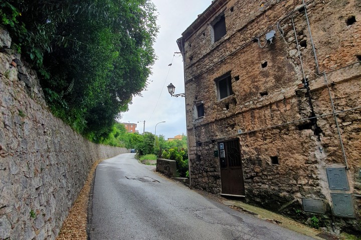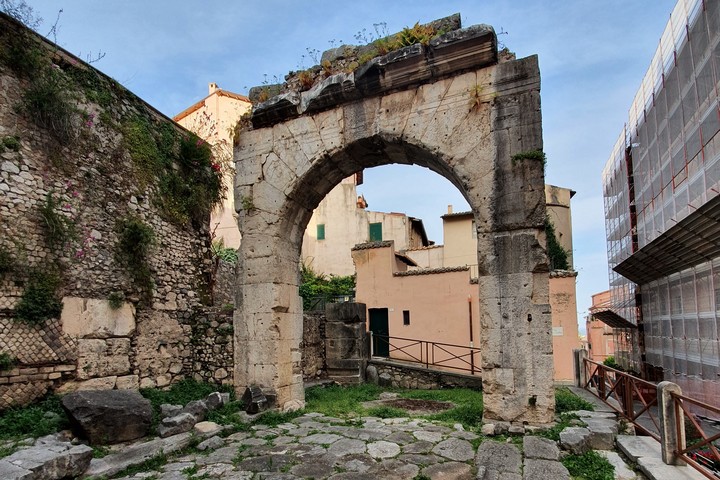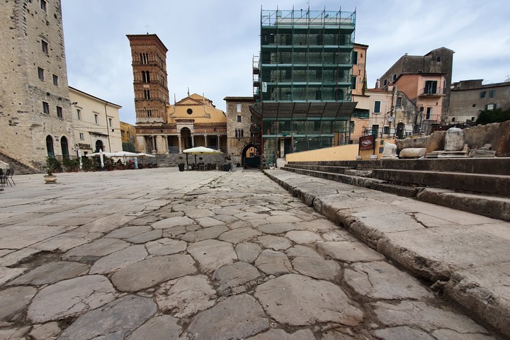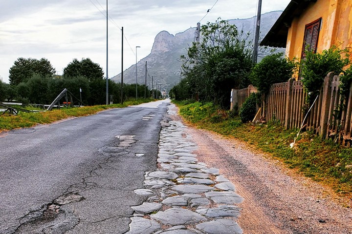 La Statale A7 ci abbandona e, dunque, a sinistra, prendo una strada che mi porta a Terracina senza passare per la parte più bassa dove sta il porto, cercando di percorrere la strada più antica che la mappa mi indica. Percorrendo questo tragitto è subito magia. A destra e a sinistra della strada asfaltata spuntano muretti a secco e qualche mausoleo. Salendo si trova una pizzeria che si chiama “Appia Antica” e poi mi trovo davanti alla Porta Romana di Terracina, una porta edificata alla fine del ‘700 sotto Pio VI. La strada che porta al centro di Terracina è un gioiello di stili architettonici di varie epoche. Essa taglia la città e sale lungo il Monte Giove. Più vado in fondo e più salgo e più la strada si fa interessante con rocce e mausolei che aumentano di numero. Fino ad arrivare al Monte Giove e al tempio romano pagano dedicato a Giove. Ma la mia strada continua dritto fino ad arrivare a Fondi.