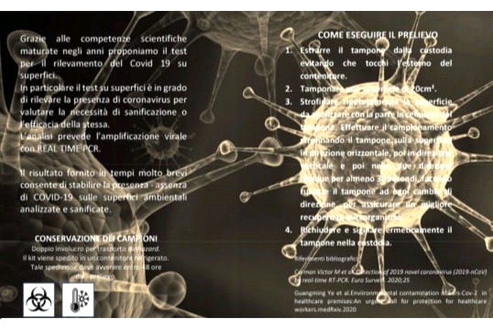 Grazie alle competenze scientifiche maturate sul campo, il Consorzio Sannio Tech - nato su iniziativa dell’imprenditore sannita Piero Porcaro, Ceo della Tecno Bios Srl - è oggi in grado di proporre un test per il rilevamento del Covid-19 su qualsiasi superficie. “In particolare, il test è in grado di rilevare la presenza del virus per valutare la necessità di sanificazione o l’efficacia della stessa”. L’analisi prevede l’amplificazione virale attraverso una tecnica chiamata REAL Time PCR. Il risultato, fornito in tempi molto brevi, consente di stabilire la presenza o l’assenza di Covid 19 sulle superfici ambientali analizzate e sanificate.