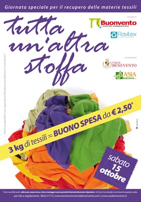 Il Centro Commeciale Buonvento di Benevento e Ravitex, società specializzata in recupero di materiale tessile, con il patrocinio del Comune di Benevento e di ASIA Benevento S.p.A., presenta Tutta un'altra stoffa, giornata speciale per il recupero delle materie tessili in programma per sabato 15 ottobre presso il Centro Commerciale di contrada San Vito.
