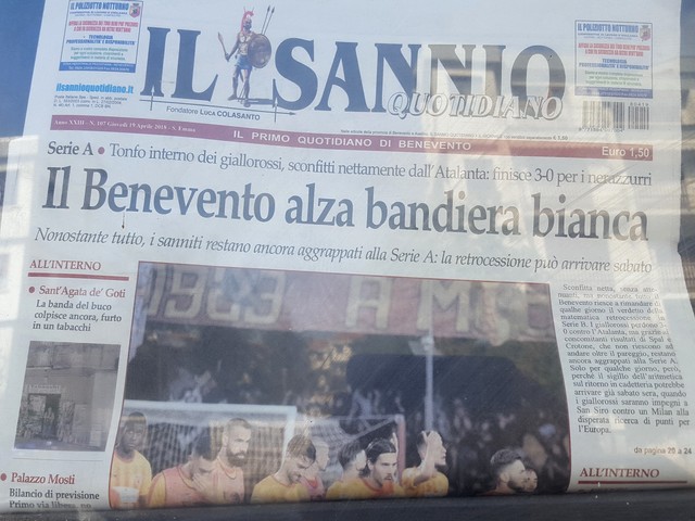 Il titolo in prima pagina del giornale dice, in sostanza, che il Benevento si è arreso. La favola della serie A a maggio finisce. Il confezionatore della locandina è di tutt'altro avviso: Il Benevento ammaina bandiera bianca. E' chiaro che la bandiera bianca era stata preparata e pure issata su qualche pennone. Qualcuno ha ordinato di ammainarla.