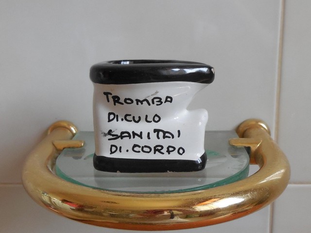 Parliamo di un simpatico posacenere in ceramica di Deruta a forma di water e con su scritto: “Tromba di c..o, sanità di corpo”.