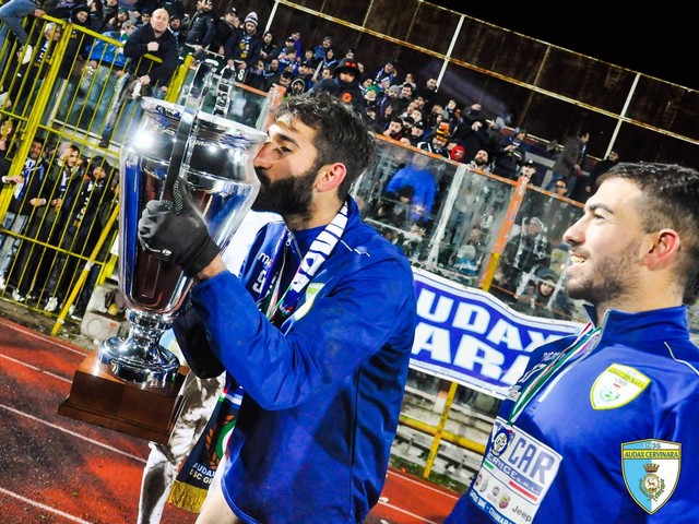 Il Cervinara regina del calcio dilettantisti campano. E’ stata una notte magica quella vissuta allo stadio “Pinto” di Caserta, dove al termine di 12 minuti e i calci di rigore la formazione biancoazzurra è riuscita a conquistare l’importante trofeo. Ma non si può non sottolineare la grandezza del risultato raggiunto dalla formazione caudina. Tre anni magici dopo il ritorno in Eccellenza, da cui mancava da un ventennio, sono serviti a conquistare un posto di rilievo nel panorama calcistico dilettante della regione. La conquista di questo importante trofeo ha coinvolto tutta Cervinara, oltre mille quelli che hanno seguito la squadra, una lunga carovana, malgrado il maltempo. Ma tutta la comunità ha partecipato all’evento, attraverso i media sono stati decine di migliaia quelli che da ogni angolo del mondo hanno seguito, sofferto e festeggiato insieme ai straordinari protagonisti biancoazzurri. Sotto una pioggia battente e non sentire niente, con il fango che ti entrava nella pelle e a continuare a lottare, la stanchezza tanta e non avvertirla, fino ai momenti culminanti dei calci di rigore dove lucidità e convinzione hanno prevalso, assegnando la meritata vittoria ad un Cervinara indomabile, che ha lottato sempre volgendo nei momenti difficili lo sguardo a quella massa di tifosi biancoazzurri che sotto la pioggia ha sostenuto in maniera impareggiabile lo sforzo dei suo ragazzi. Difronte ad uno spettacolo del genere, sono arrivati anche gli applausi dei tifosi avversari, bisogna inchinarsi al Cervinara che ha regalato emozioni e una stupenda serata di sport, onorata da tutte le sue componenti, Società, Squadra e tifosi.