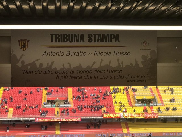 La cerimonia d’inaugurazione della nuova tribuna stampa dello stadio comunale “Ciro Vigorito”, tenutasi sabato 16 marzo poco prima dell’inizio della partita del Benevento contro lo Spezia, valida per la 29ª giornata del campionato di serie B, ha creato in più d’uno qualche mugugno subito riportato nei loro pezzi dai colleghi presenti. Ricordiamo che la tribuna stampa è stata intitolata ai giornalisti sportivi Nicola Russo e Antonio Buratto, scomparsi a pochi mesi di distanza, luglio, il primo, e settembre, il secondo, dello scorso anno.