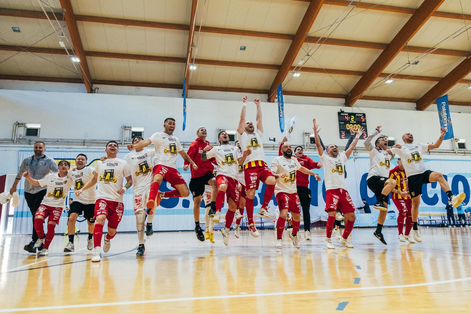 Tutta ‘nAta storia. Il GG Team Wear Benevento 5 espugna il PalaTorrino, batte la Lazio e conquista la promozione in Serie A con una giornata d’anticipo: gli uomini di Fausto Scarpitti centrano il double dopo il successo in Coppa Italia di due settimane fa ad Ancona. È tripudio giallorosso.
